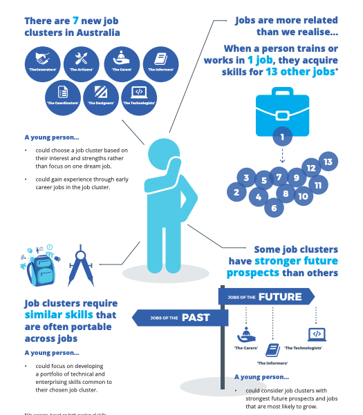 The Foundation for Young Australians (FYA) analysed 2.7 million job adverts across a range of professions and identified 4600 skills which could be categorised into seven job clusters. They also identified 21st-century key skillsets which had to be developed in today’s students. These included: