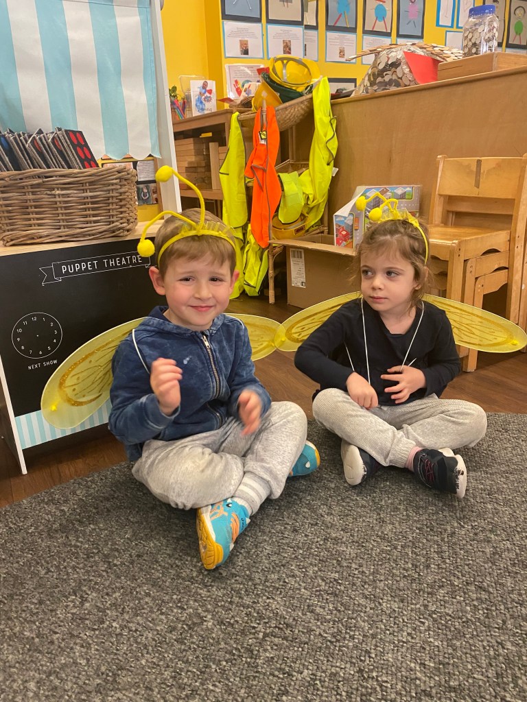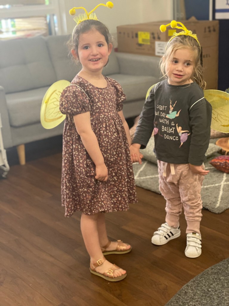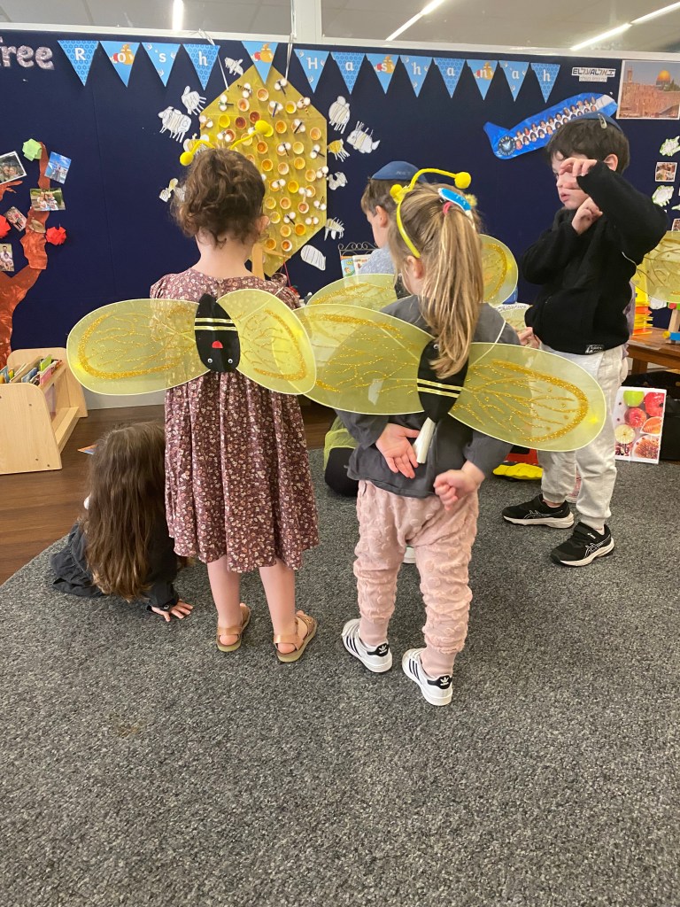 During the last few weeks, our Early Learners have started their Jewish Studies lessons by looking at the Rosh Hashanah items inside the chag box. The lessons have been filled with delightful experiences, starting with the tradition of dipping apples in honey and our children’s faces lit up with wonder as they savoured the sweet combination, symbolising hopes for a year filled with sweetness and blessings. We all pretended to be devorim (bees) and flew around the classroom. We sang tapuchim udvash le Rosh Hashanah (see the words below) and learnt a new dance to the song Matana LeRosh Hashana. Shalom the sheep and his little baby sheep Shlomit visited each class to tell the children a story about their special friends ‘shofy and blowfy’! You can read the story below.